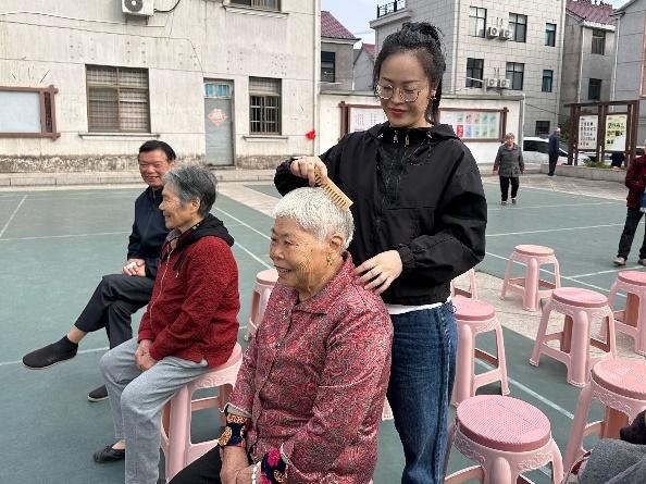 物資表心意,服務(wù)更暖心?;顒?dòng)現(xiàn)場(chǎng)專門設(shè)置了公益理發(fā)、健康義診、推拿服務(wù)等志愿項(xiàng)目,由醫(yī)生和志愿者們?yōu)槔先颂峁┵N心服務(wù),現(xiàn)場(chǎng)氣氛溫馨而有序。87歲的章秋玉老人家在推拿醫(yī)生按完肩頸后,紅了眼眶:“年年都想著我們,真是和家里人一樣親。”?